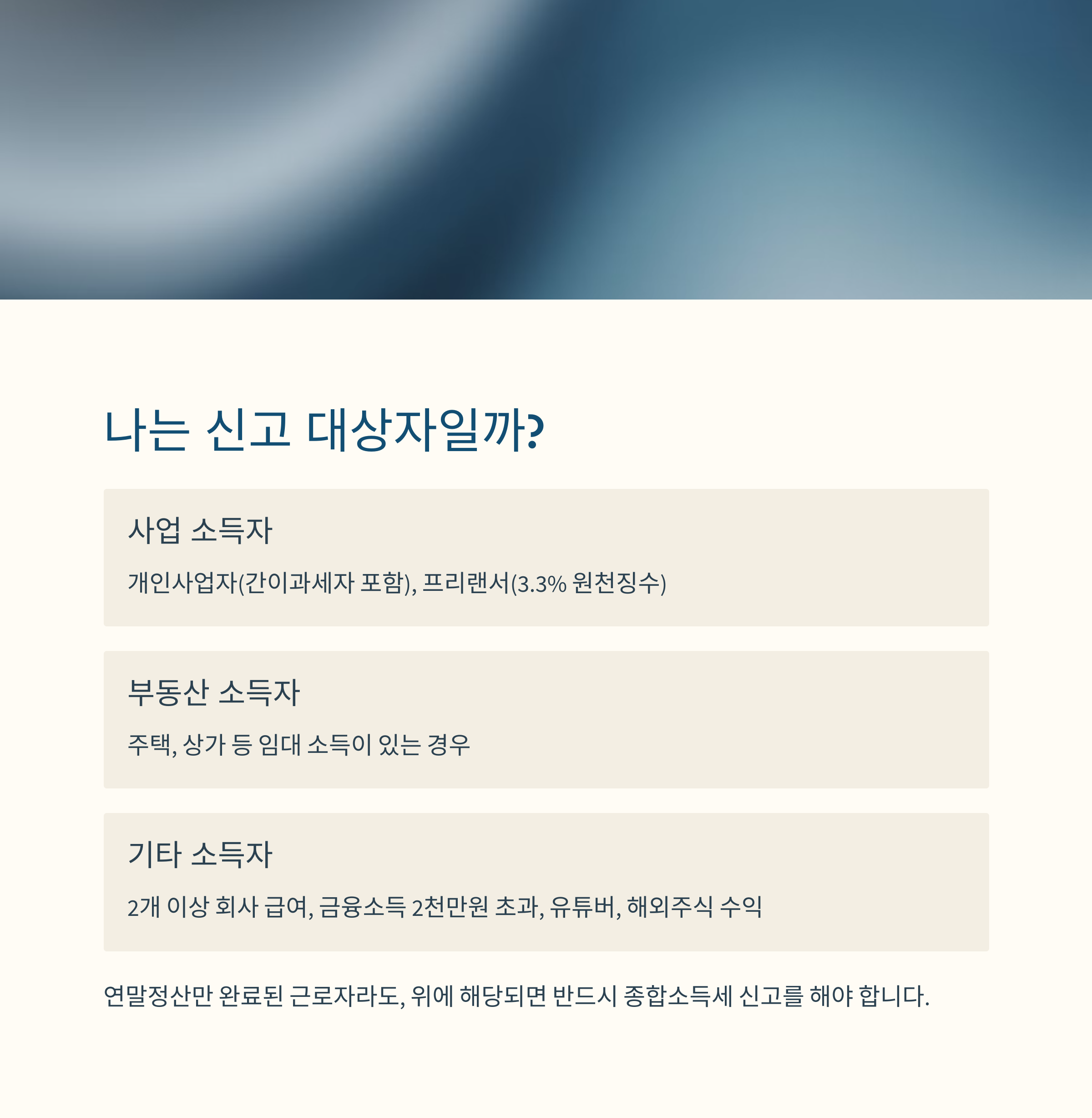 "연말정산만 완료된 근로자라도, 위에 해당되면 반드시 종합소득세 신고를 해야 합니다."