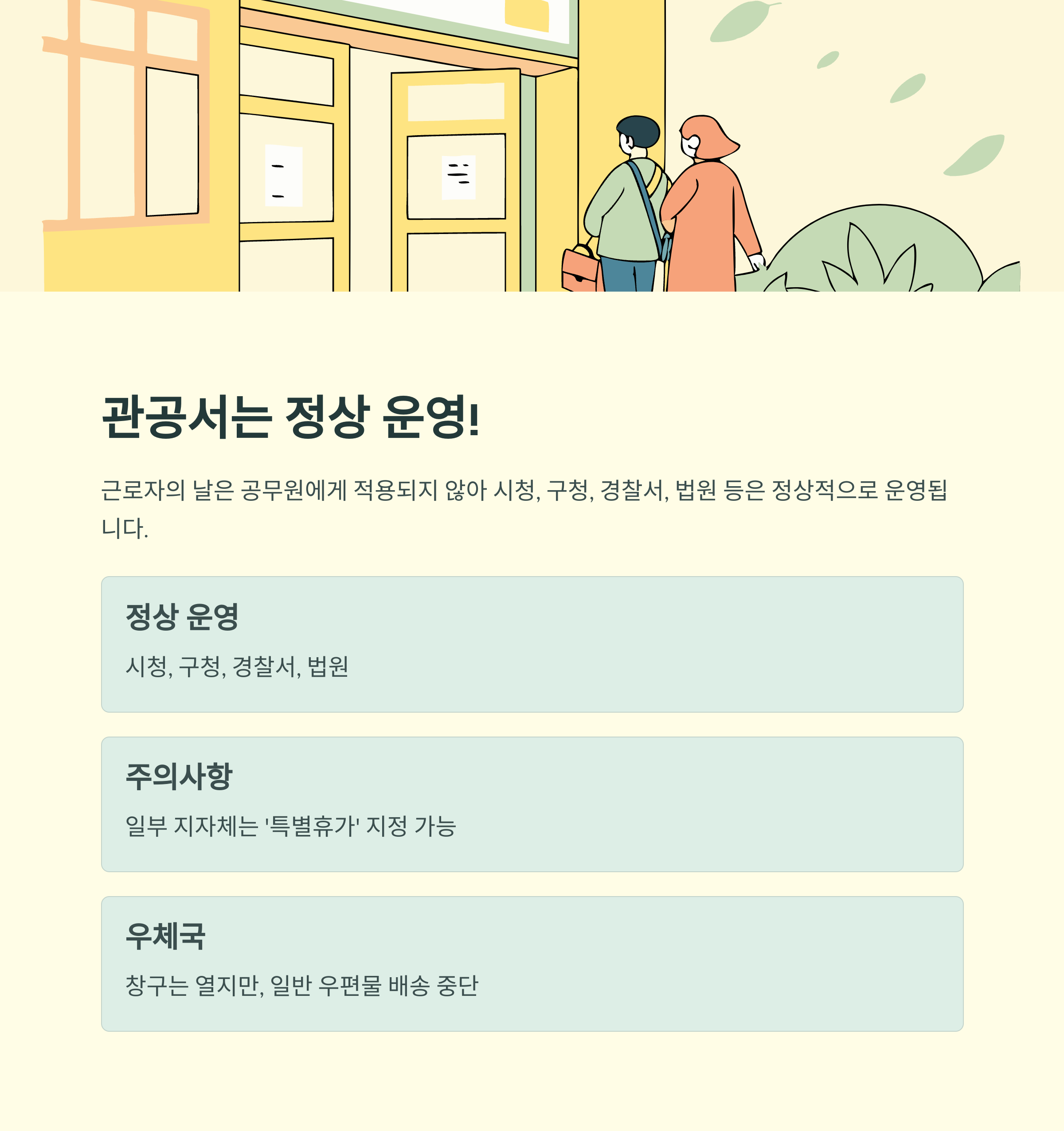 | 관공서 | 정상 운영 | 특별휴가 여부 확인 필요 |
