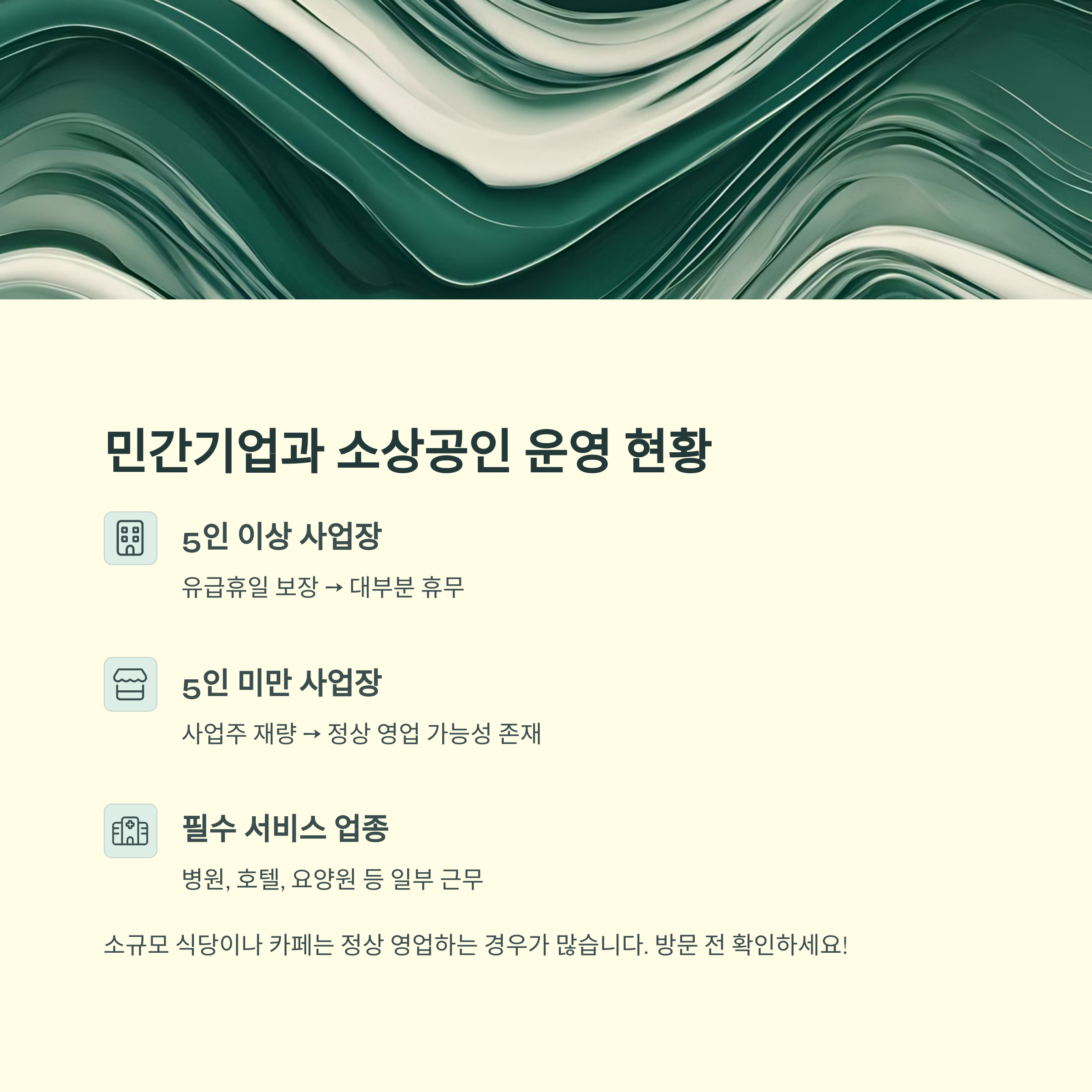 | 민간기업 | 사업장 규모 따라 다름 | 5인 이상은 휴무, 5인 미만 재량 |